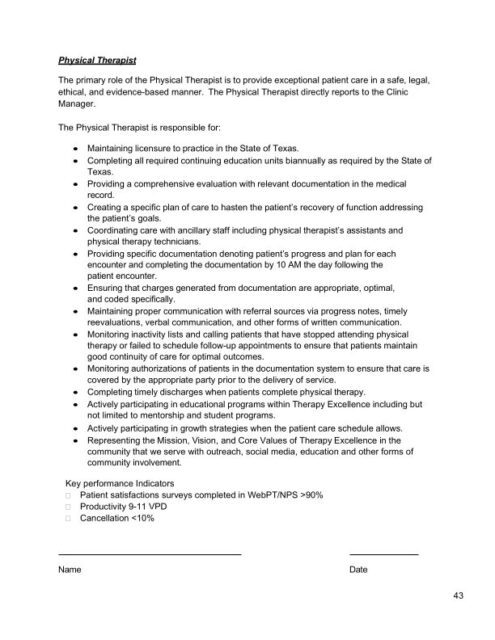 The primary role of the Physical Therapist is to provide exceptional patient care in a safe, legal, ethical, and evidence-based manner. The Physical Therapist directly reports to the Clinic Manager.